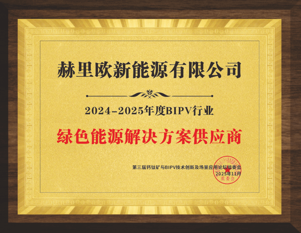 在本次论坛的颁奖典礼上,赫里欧凭借其安全、高效、智能、建材化的全栈式BIPV解决方案,荣获: ■ 《2024-2025年度BIPV行业绿色能源解决方案供应商》 ■ 《2024-2025年度BIPV光伏行业领军人物奖》(授予赫里欧新能源有限公司总经理崔永祥) ——致敬其带领团队坚持技术初心,在市场中开辟BRPV新路径的远见与担当。