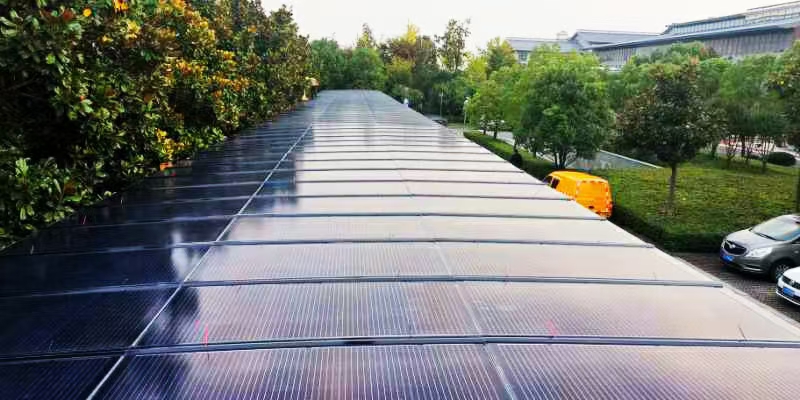 作为“大型车棚+屋顶”型式的分布式光伏项目,车棚顶面采用BIPV光伏一体化结构,以光伏组件代替车棚的顶面,实现发电功能的同时,还能起到遮阳防雨的作用。而且有效降低车棚下温度约15℃左右。